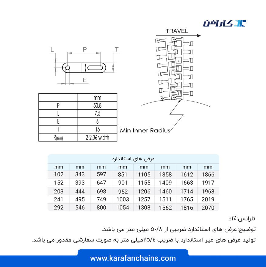 | جدول مشخصات فنی تسمه مدولار چرخشی ( اسپیرال ) گام 2 اینچ - آبی | |