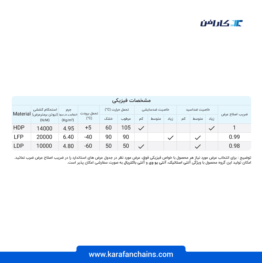 | جدول مشخصات فنی تسمه مدولار حرکت مستقیم گام 1 اینچ، دارای زوائد استوانه ای شکل با گذر 40% ( آبی ) | |