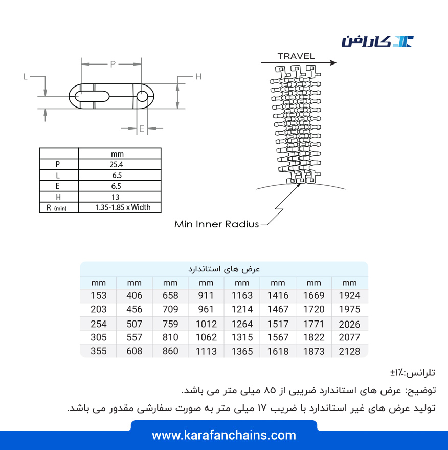 | جدول مشخصات فنی تسمه مدولار چرخشی ( اسپیرال ) گام 1 اینچ جدید { آبی } | |