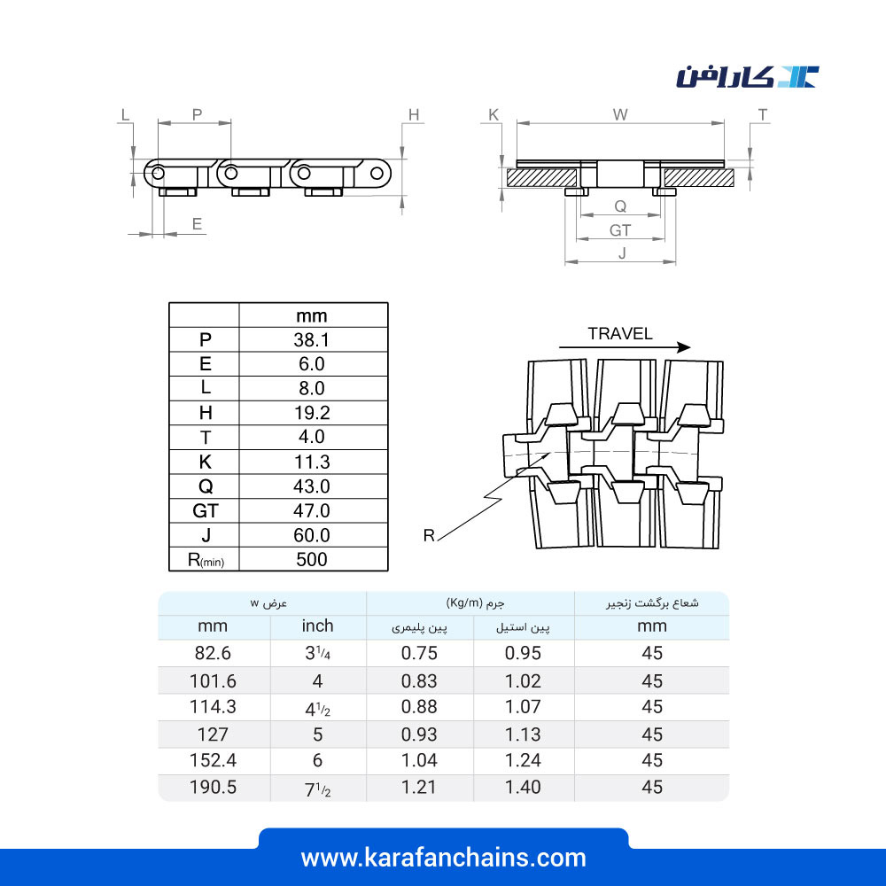 | جدول مشخصات فنی زنجیر تخت چرخشی پلیمری گام 38.1 میلیمتر عرض 152.4 میلیمتر | |